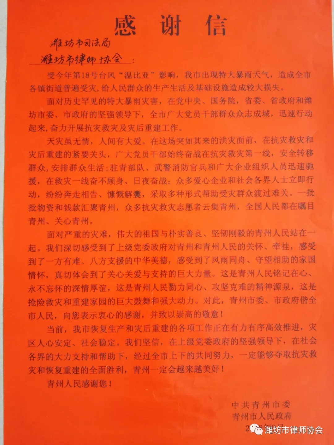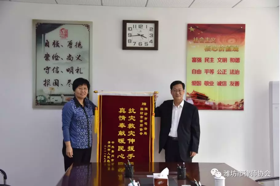 9月28日下午,青州市司法局党组书记、局长袁晓颖,党组成员、副局长文福亮一行代表中共青州市委、青州市人民政府到800彩票,为潍坊市司法局、800彩票送来一面“真情奉献暖民心 抗灾救灾伸援手”的锦旗和为青州市抗灾救灾捐款的感谢信。潍坊市司法局四级调研员田峥、市律师协会会长马东宁、副会长杨宪军、市司法鉴定协会会长李茂竹参加座谈会。
