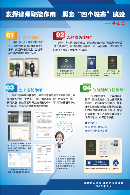 “发挥律师职能作用 服务四个城市建设——基础篇”律师宣传挂图,从“什么是律师?”“怎样成为律师?”“怎么委托律师?”“如何判断真假律师?”四个方面以图文形式详细阐述了律师职业的相关常识,旨在引导广大人民群众正确辨识律师真伪、知晓聘请律师程序、认识律师职业性质等。为增强挂图宣传效果,除实地张贴外,《潍坊日报》 3月26日第四版也专门予以刊发。