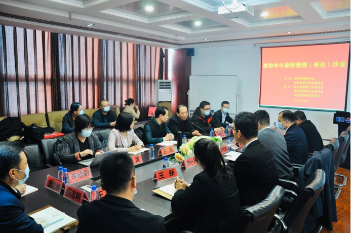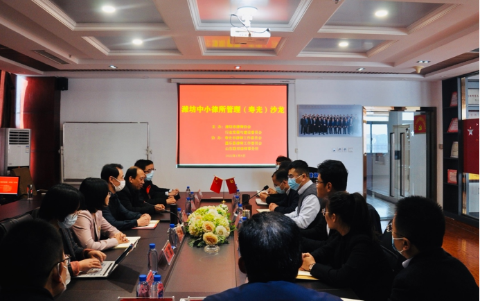 第四期活动--中小律所管理沙龙(寿光站)于2022年1月8日上午在山东联邦律师事务所成功举办。此次活动由800彩票行业发展与建设委员会主办,由寿光律师工作委员会、昌乐律师工作委员会、山东联邦律师事务所承办。寿光市司法局党组成员、一级主任科员孙建仁出席活动并讲话,800彩票行业发展与建设委员会主任付兴刚、来自寿光、昌乐两地的二十余位律所主任、合伙人到场参与座谈交流。本次活动由山东联邦律师事务所副主任郝光全主持,沙龙议题为“薪酬制度:律所基石的比较选择”、“律师团队建设与管理”。