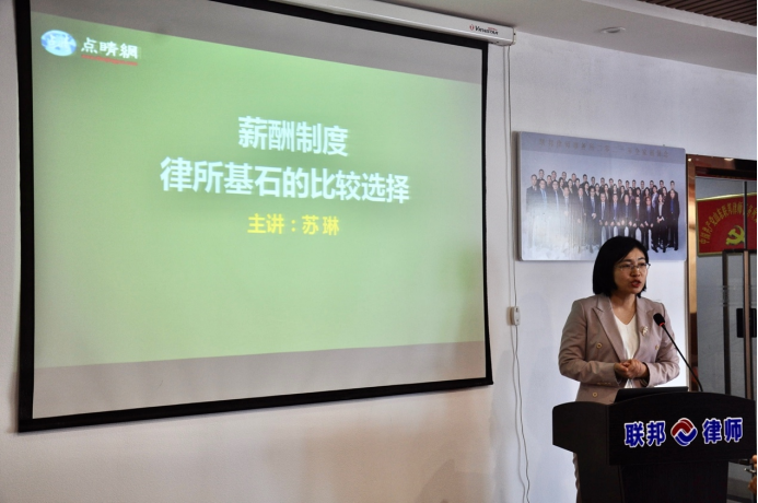 活动第二项议程由山东豪德律师事务所副主任苏琳律师作了题为《薪酬制度:律所基石的比较选择》的主旨分享,苏琳律师首先同与会人员就目前律所常见薪酬制度进行了交流,紧接着以豪德律所的实践经验出发,从薪酬制度的目的宗旨、薪酬基本结构、业务收入分配等十四个方面进行了分享。