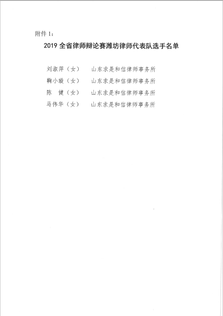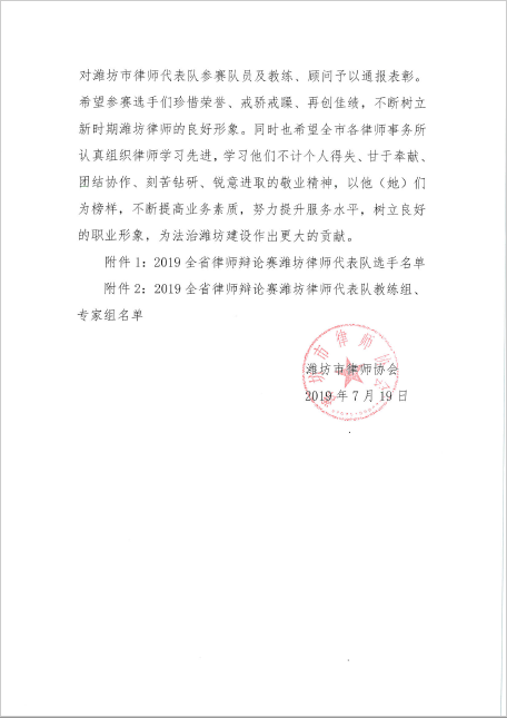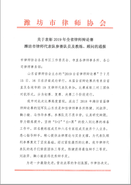 关于表彰2019年全省律师辩论赛潍坊市律师代表队参赛队员及教练、顾问的通报